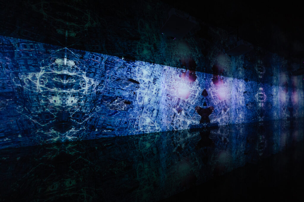 The Façade Projection serves as a carrier of collective memory, containing various energies and vibrations within its abstract contours. It takes inspiration from the concept of a portal, guiding and transporting viewers into a realm of the unknown. The fractal world in the artwork transcends the limitations of time and space, and when gazed upon, one can sense the pulsation of life within it. Like a living sculpture, it possesses its own vitality.